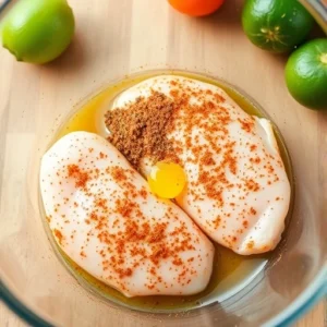 - In a bowl, combine the chipotle seasoning, olive oil, and lime juice. Rub the mixture all over the chicken breasts.