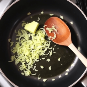 - In a skillet, melt the butter over medium heat. Add the shallot and garlic, cooking until soft and fragrant, about 2-3 minutes.