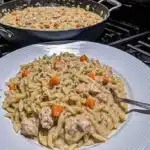 Creamy Chicken Pot Pie Orzo is a cozy one-pot dinner with tender chicken, vegetables, and orzo pasta in a rich, creamy sauce.