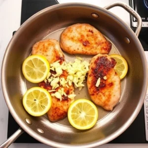 - Add Garlic and Lemon: After searing, add the minced garlic and lemon slices to the skillet. Allow the garlic to cook for about 30 seconds, being careful not to burn it. If desired, you can deglaze the pan with white wine, which adds a layer of flavor to the dish.