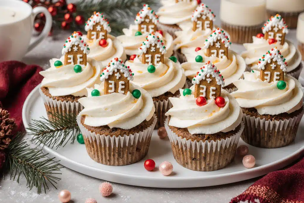 Adorable gingerbread cupcake bites topped with creamy frosting, festive sprinkles, and mini gingerbread house cookies. Perfect for holiday parties and family baking.