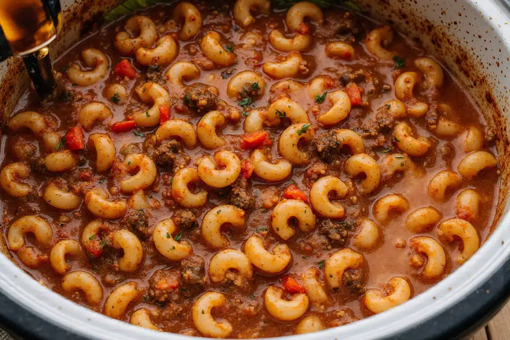 A hearty and comforting Crockpot Goulash made with tender pasta shells simmered in a rich, beefy tomato sauce. Perfect for family dinners and large gatherings.