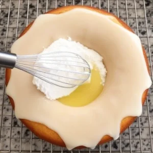 - Once the cake has cooled, drizzle the glaze over the top, allowing it to drip down the sides.
