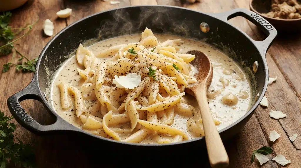 This simple pasta recipe is a weeknight hero. The creamy texture, balanced seasoning, and irresistible aroma of garlic make it a family favorite. Every bite is silky, cheesy, and full of flavor. Plus, since it’s a one-pot dish, you save time and effort while keeping your kitchen spotless.