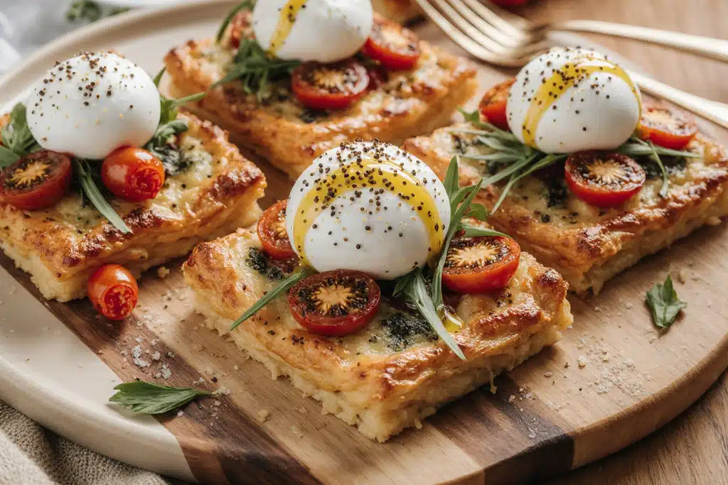 9. Add Burrata: Remove from oven, tear fresh burrata over the tart, and add fresh herbs if desired.