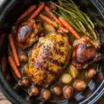 A simple and flavorful one-pot slow cooker meal featuring tender honey garlic chicken thighs and perfectly cooked vegetables. No sautéing or browning required—just mix, dump, and cook.